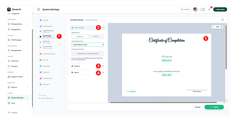 Access the studio via Appearance > Certificates. You can create a global default template or assign specific designs to individual exams in the Exam Manager.
