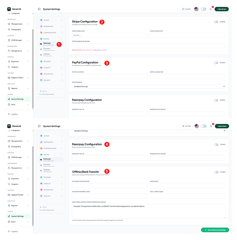 Workflow: Students upload a receipt -> Admin verifies it in "Finance > Payments" -> Admin approves transaction.