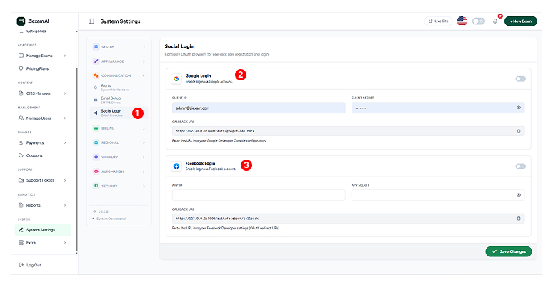 When setting up the apps in Google/Facebook, you must copy the Callback URL displayed on this page (e.g., https://yoursite.com/auth/google/callback) and paste it into the "Authorized Redirect URIs" field in their respective developer consoles.