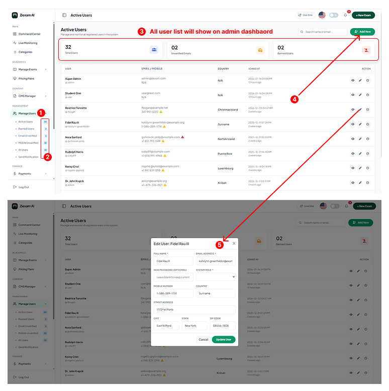 Click the "Add New" button to manually onboard a user. This is essential for creating Staff/Admin accounts or registering students who cannot access the frontend signup page.